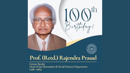 We extend our heartfelt wishes to Prof. (Retd.) Rajendra Prasad, former faculty member and Head of the Department of Humanities & Social Sciences (1982โ1985), on the occasion of his 100th birthday.