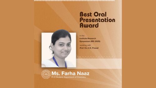 We are delighted to share that Ms. Farha Naaz, Ph.D. scholar from the Department of Chemistry, has received the Best Oral Presentation Award at the Institute Research Symposium (IRS 2025), held at IIT Kanpur.